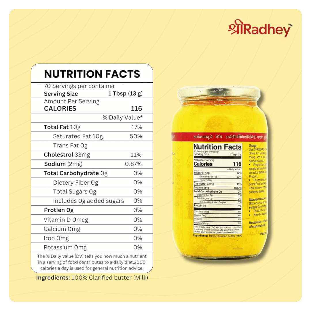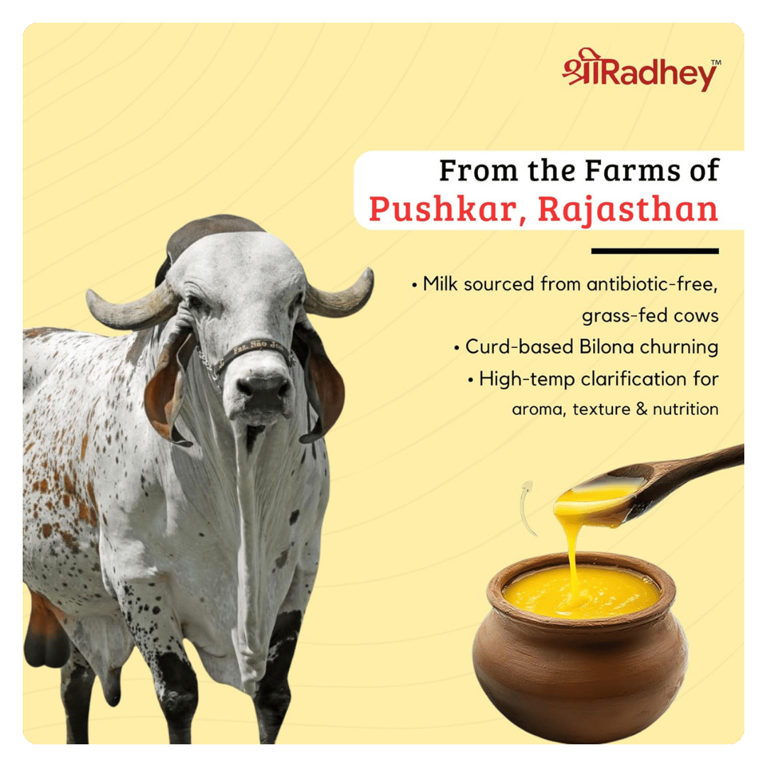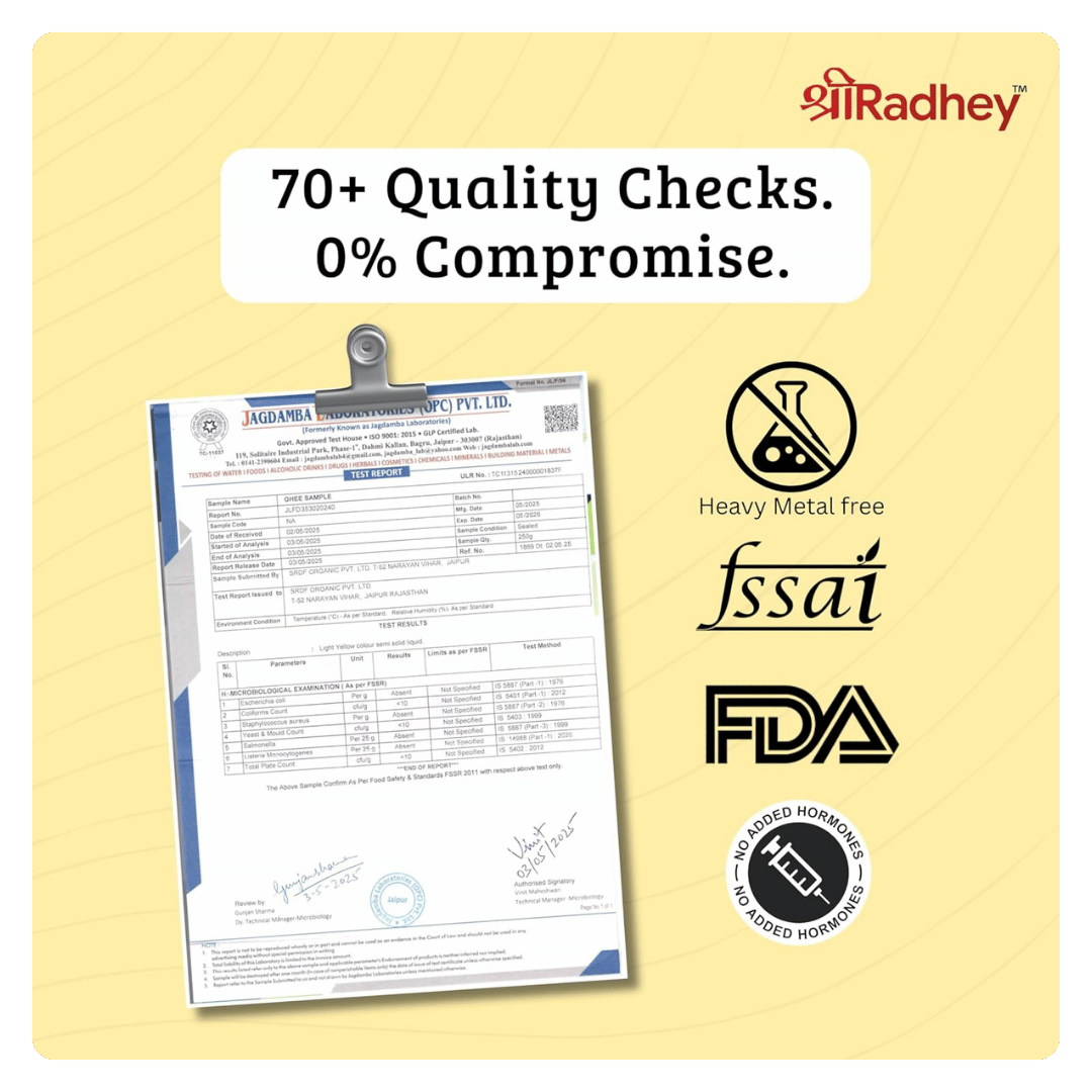 Every batch is NABL-tested, ensuring safety, purity, and premium quality. Shreeradhey packs the ghee in high-quality glass bottles to preserve freshness, taste, and aroma while avoiding the toxins commonly associated with plastic packaging.