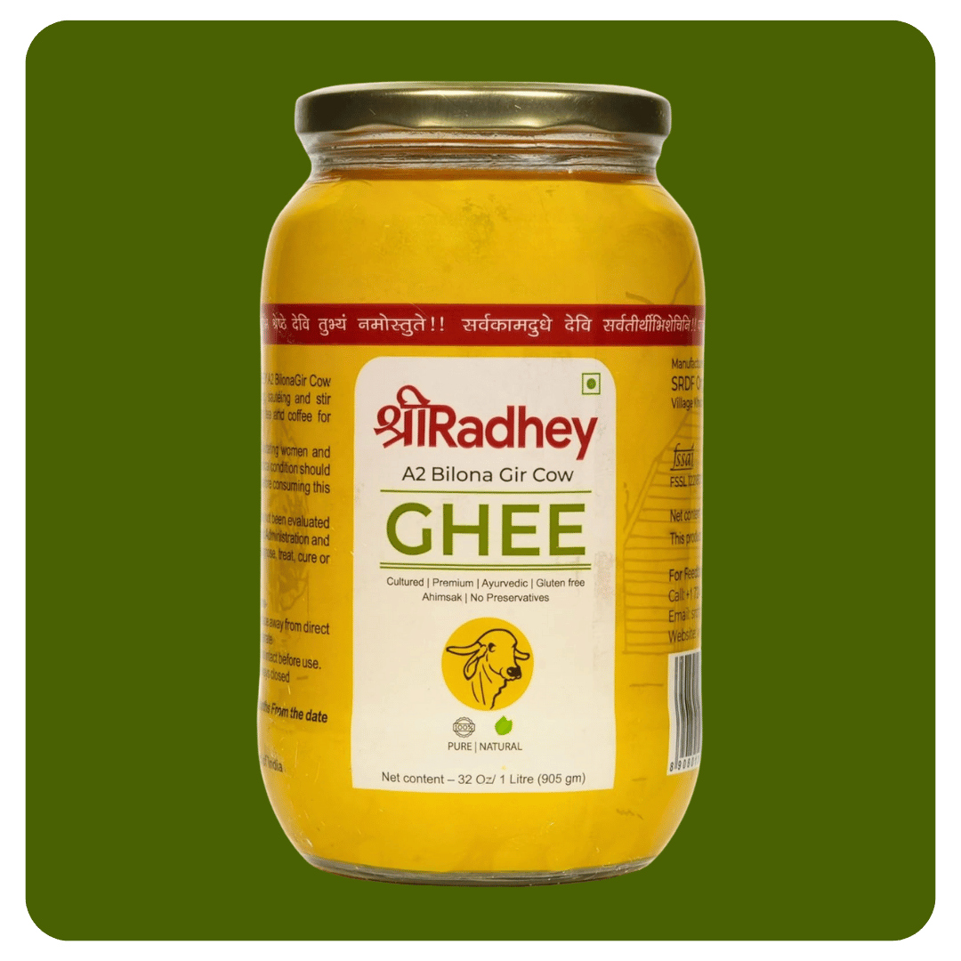 Shreeradhey A2 Gir Cow Ghee – Traditional Bilona Method (1L Glass Bottle, 1.53kg)