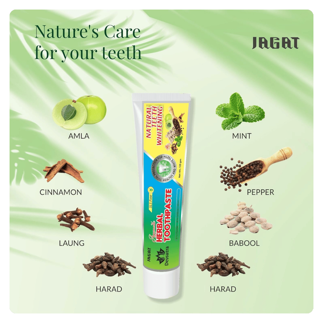 Jagat Herbal Mint Toothpaste is a fluoride-free toothpaste formulated with a blend of plant- and herb-based ingredients for routine oral cleansing and freshness. The formulation avoids artificial colours, flavours, preservatives, and strong foaming agents, focusing on basic oral hygiene rather than cosmetic or intensive dental claims.