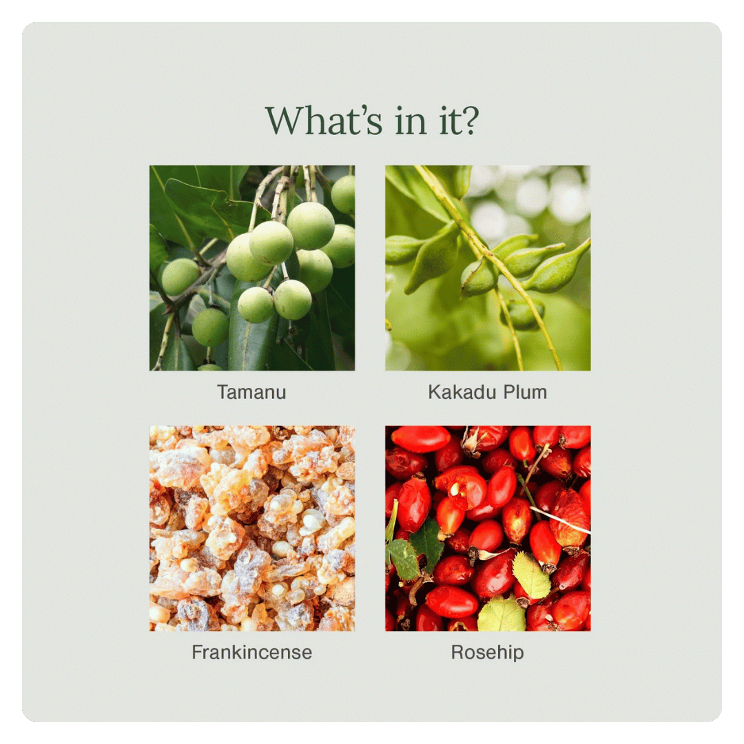 Enriched with Kakadu Plum, rich in antioxidants and natural Vitamin C, it helps reduce pigmentation and dark spots, while Tamanu Oil replenishes the skin with essential fatty acids for smoothness and even tone.