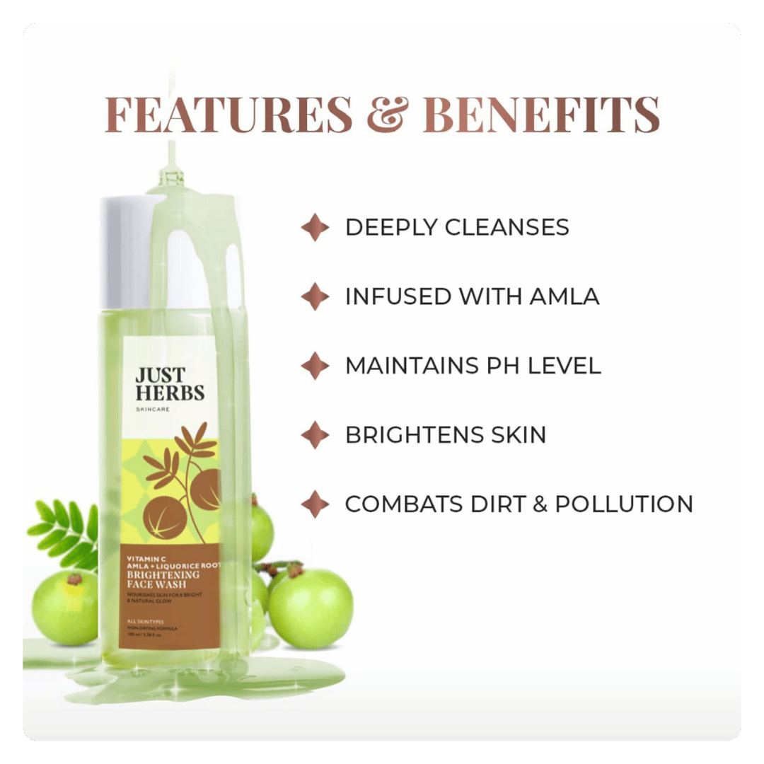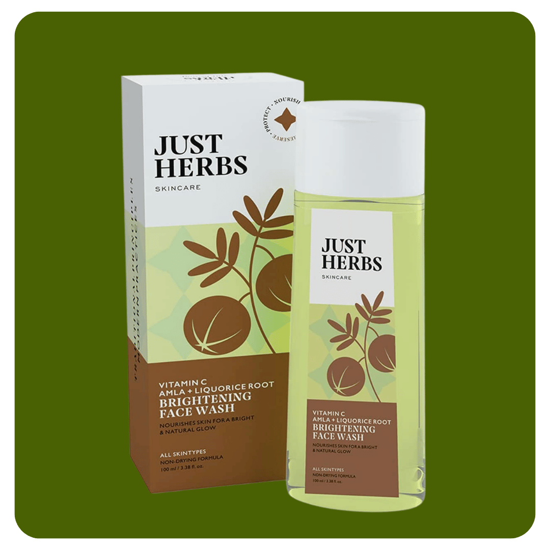 Just Herbs Brightening Face Wash blends potent natural ingredients like Vitamin C, Amla and Liquorice Root to give your skin a fresh, radiant glow. This face wash works deeply to reduce pigmentation, dark spots and uneven skin tone, bringing out brighter and healthier skin over time.