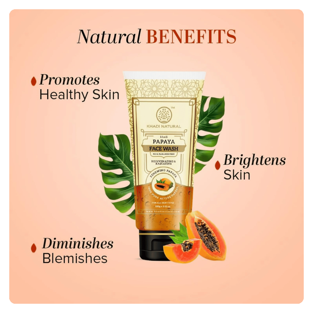 Khadi Natural Papaya Face Wash is a pure herbal formula crafted to brighten and rejuvenate your skin naturally. Enriched with the goodness of Papaya Extracts, it gently removes dirt, impurities, and dead skin cells while improving skin texture and clarity.