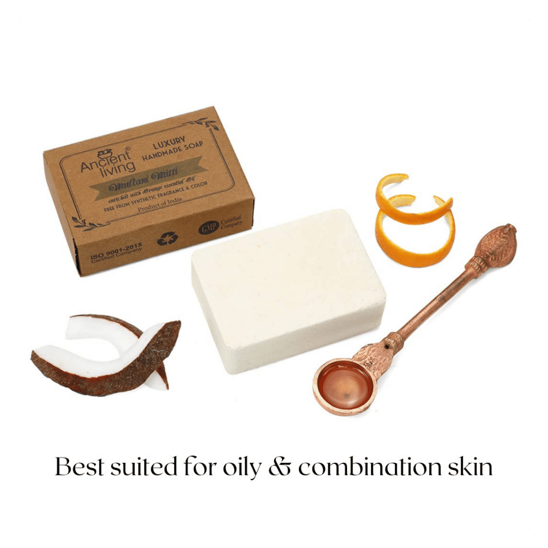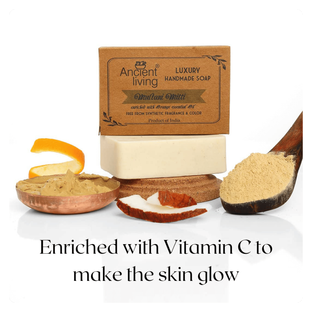 Ancient Living Multani Mitti Handmade Soap is a luxurious Ayurvedic cleanser crafted with pure Multani Mitti (Fuller’s Earth), known for its deep-cleansing and exfoliating properties. This natural clay purifies the skin, removes excess oil, unclogs pores, and helps control acne, making it ideal for oily and combination skin types. Blended with pure orange essential oil, the soap delivers a refreshing citrus aroma while enriching the skin with Vitamin C, offering brightness, hydration, and rejuvenation.