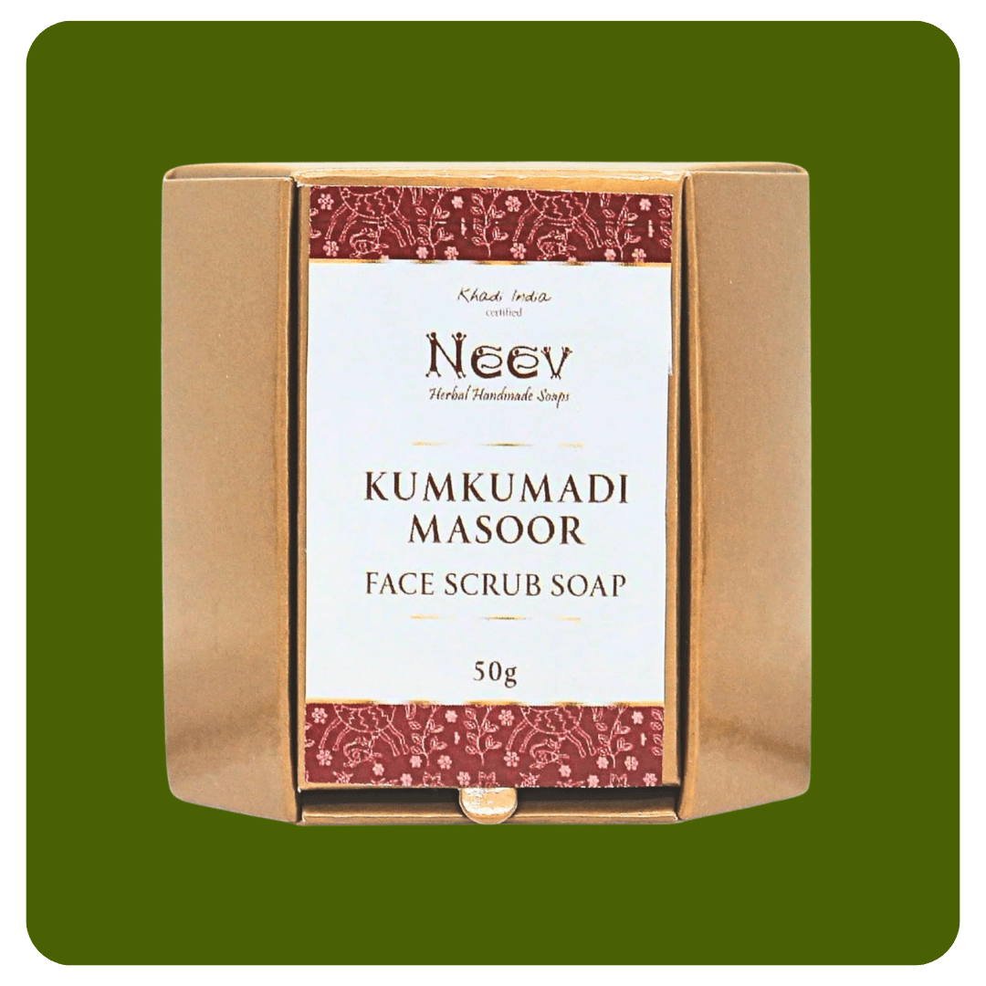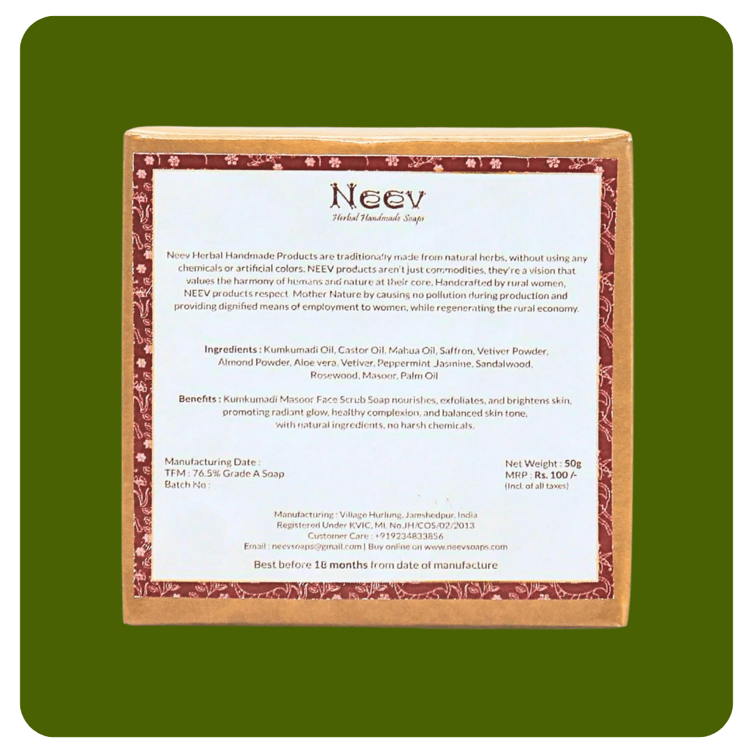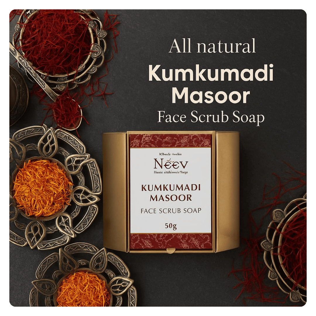 Neev Soaps Kumkumadi Face Scrub Soap is a handcrafted Ayurvedic cleanser made with the richness of Kumkumadi Oil and Saffron to bring a natural glow and smoothness to your skin.