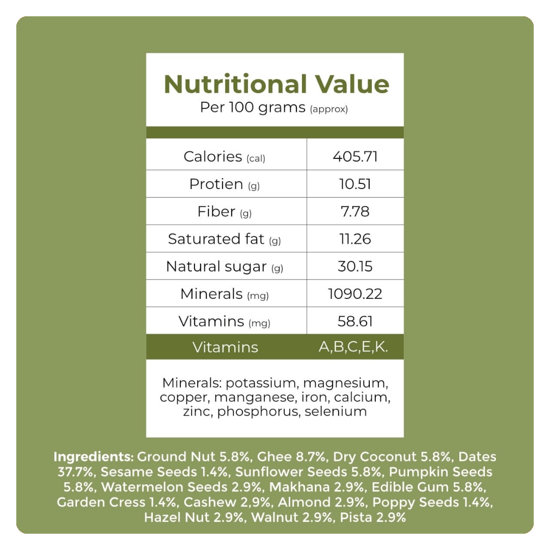 The formulation does not include refined sugar, preservatives, or artificial flavors. Ghee and gondh are used as binding agents, both of which have been traditionally used in Indian households for strength and nourishment.