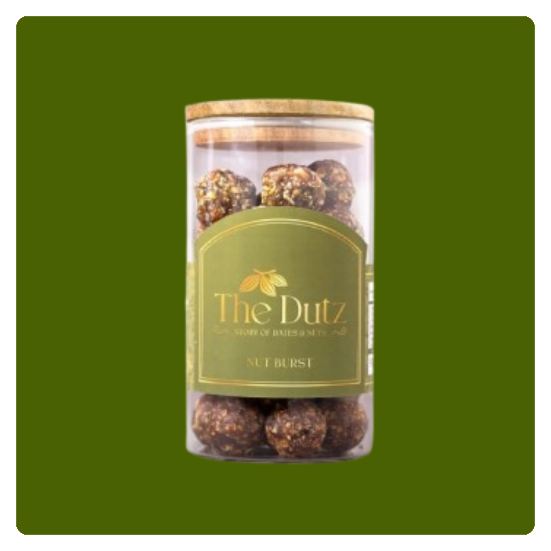 Nut Burst laddus are a traditional Indian sweet prepared using dates (37.7%) as the primary natural sweetener, instead of refined sugar. The product is made with a combination of ghee, edible gum (gondh), nuts, and a variety of seeds, aiming to deliver energy along with nutrition.